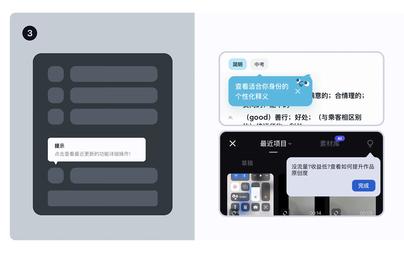 當用戶第一次點擊某個功能(比如新按鈕、新模塊)時,用小氣泡給出簡短說明,不打斷操作流程,很適合功能細節(jié)引導。