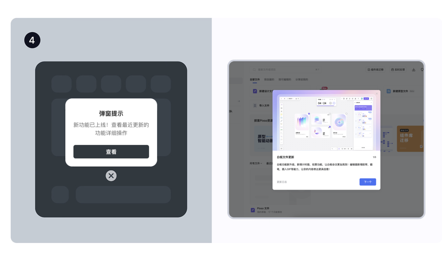 • 例子:Pixso 更新白板功能后,用彈窗提示 “新增計時器、投票功能”,用戶看完能直接點 “查看” 或 “關(guān)閉”;