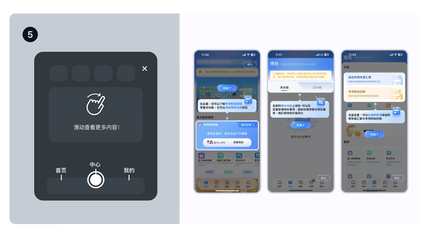 • 例子:稅務(wù) APP 新增 “待辦功能” 后,會在 “待辦” 入口旁彈氣泡,告訴用戶 “這里能處理未辦結(jié)事項”,用戶點 “知道了” 就關(guān)閉,不影響正常使用;