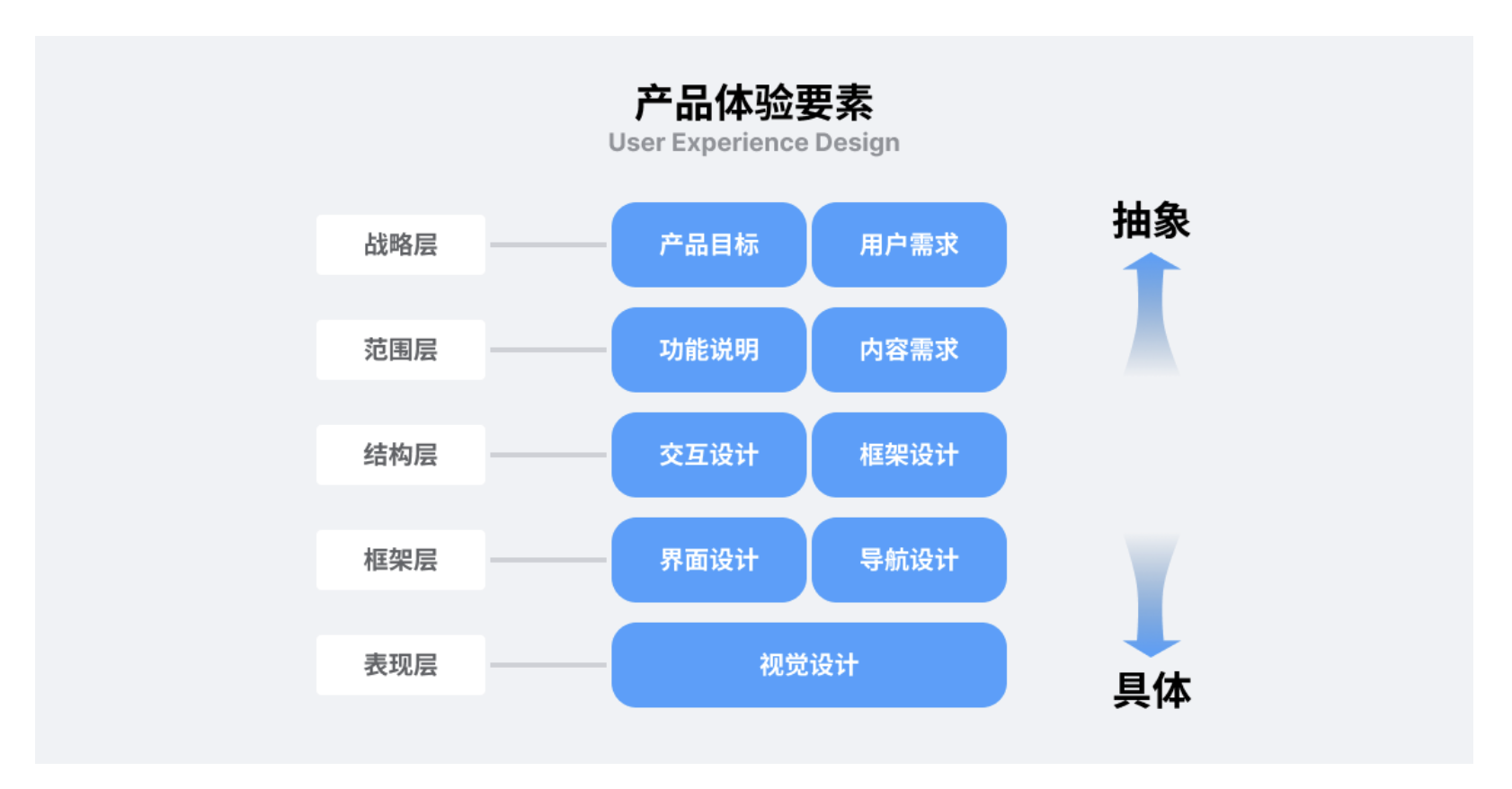 要理解它的核心,繞不開經典的產品體驗五層級模型。這五個層級從抽象到具體,像搭建一座房子一樣層層遞進,少了任何一層,體驗都會 “塌掉”: