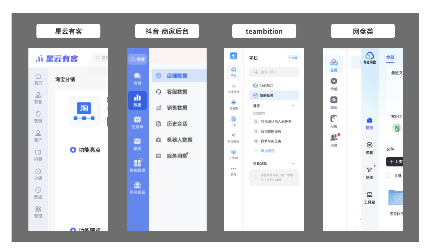 - 細欄(垂直導航):以圖標為核心,文字輔助說明,適用于模塊較少、需最大化展示內容區域的場景,如網盤類產品、輕量型工具后臺。優勢是簡潔高效,能減少導航對核心工作區的占用,但要求用戶對圖標含義有較高認知度,典型案例包括夸克網盤、Teambition 企業版。