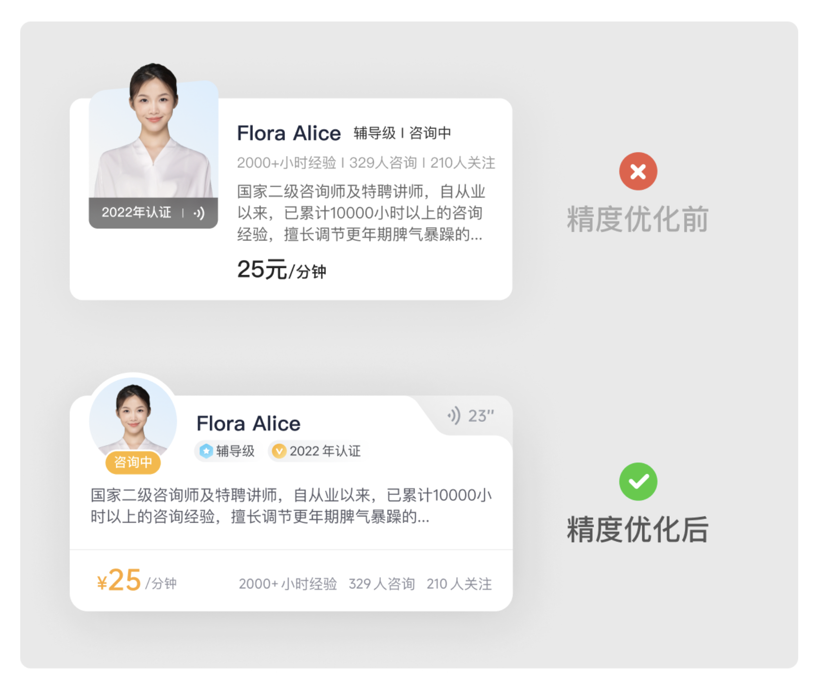 卡片中的關鍵數據(如咨詢費用、經驗時長、咨詢人數)需要重點突出,但要避免多個視覺焦點沖突。可將費用 “25 元 / 分鐘” 改為 “¥25 / 分鐘”,放大字號并加粗;其他數據保持統一字號,用間距區分,讓用戶一眼就能捕捉到核心信息,提升決策效率。