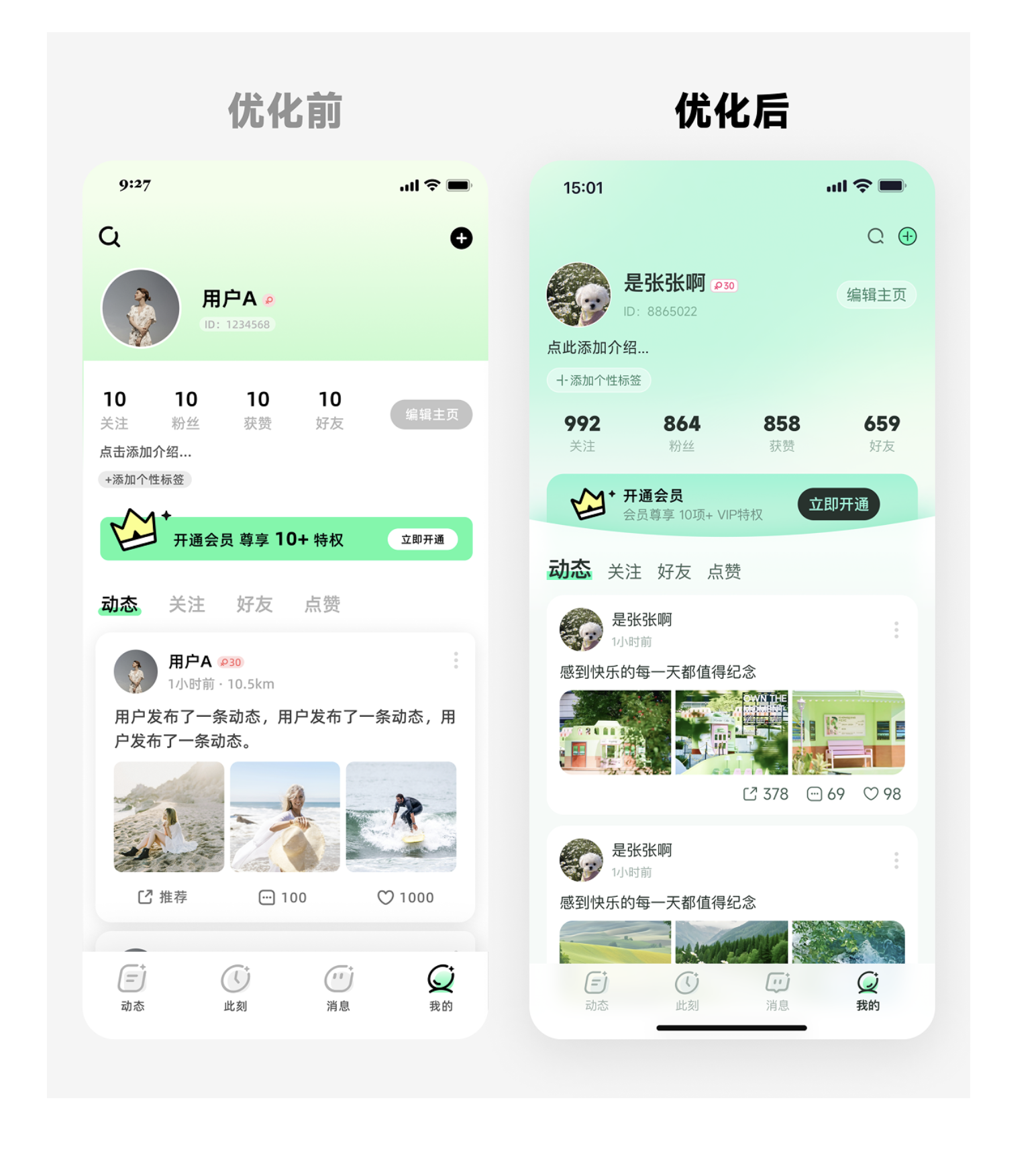 優(yōu)化重點是 “做減法”:刪除與內(nèi)容無關(guān)的干擾元素,聚焦用戶發(fā)布的動態(tài)本身;用不同背景色區(qū)分不同類型的動態(tài)卡片,替代厚重的投影,讓頁面更通透;同時優(yōu)化卡片間距和內(nèi)邊距,避免視覺擁擠,讓整個動態(tài)流更清爽易讀。