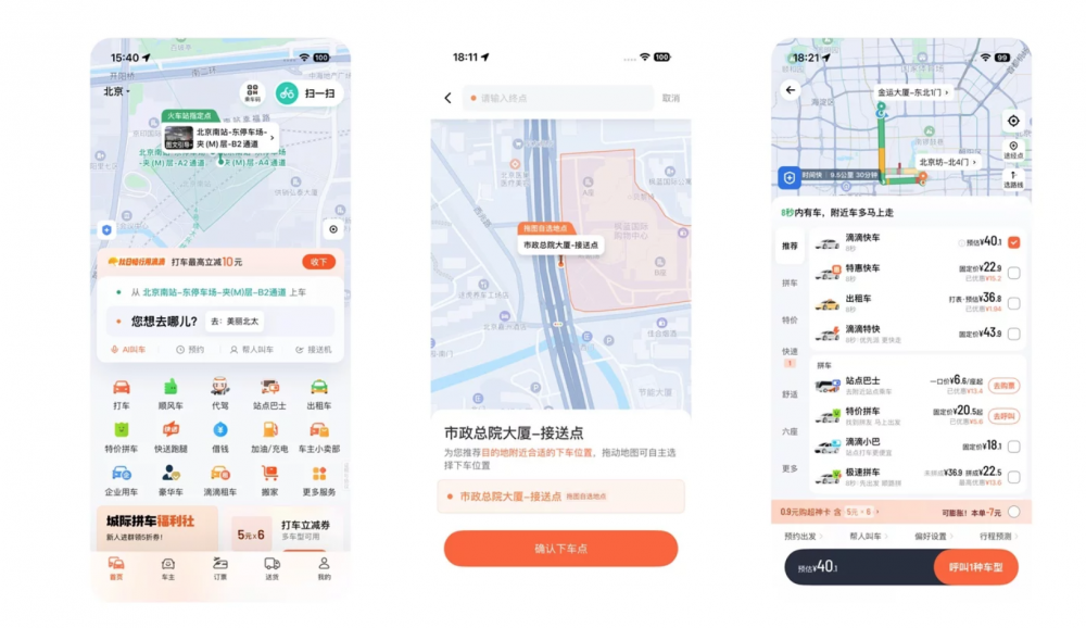 滴滴國內版則采用 “高飽和度、多色彩分區” 策略:橙色代表主叫車業務、綠色代表拼車、藍色代表巴士服務,同時用紅色標注擁堵路況、綠色標注暢通路況。通過強烈的色彩對比明確功能邊界,吸引用戶注意力,貼合國內用戶對 “明確區分” 與 “熱鬧感” 的視覺偏好,營造出活力滿滿的產品氛圍。