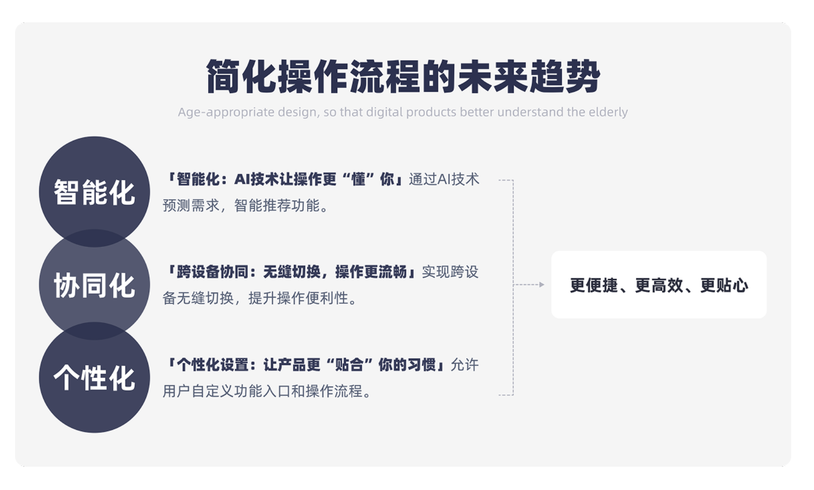 當下,適老化設計已不再是 “錦上添花” 的加分項,而是數字產品必須承擔的社會責任。隨著 AI 技術的發展,未來的適老化設計還將朝著智能化、協同化、個性化方向邁進 —— 通過 AI 預測老人需求,智能推薦常用功能;實現跨設備無縫切換,讓操作更流暢;允許用戶自定義功能入口,讓產品更貼合個人習慣。