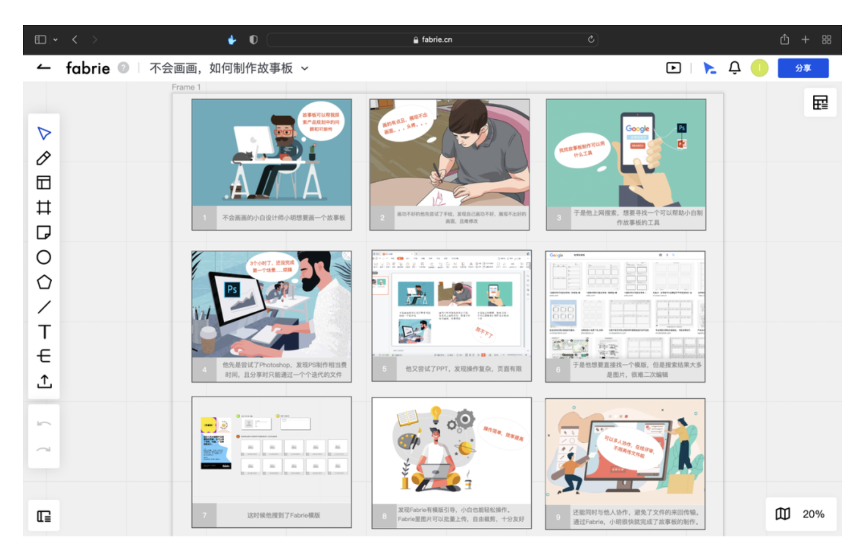 - 故事板:即使不會畫畫,也能通過模板快速搭建場景,用圖片、文字還原用戶使用產品的過程,直觀展現(xiàn)設計價值。