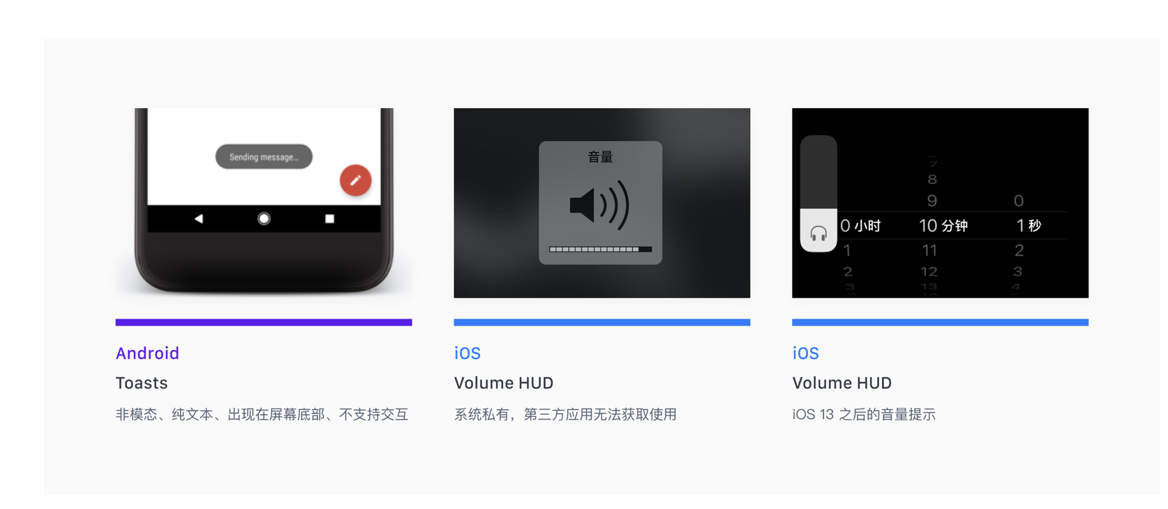 - 使用場景:通知操作結果(如 “保存成功”“加載失敗”)、短暫狀態提示(如 “音量調節”)。