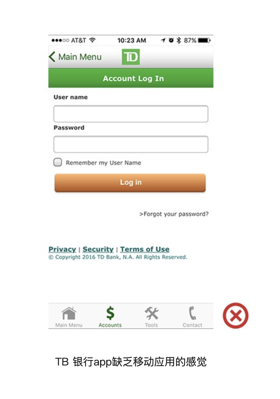 網頁端的交互模式與頁面元素,并不完全適用于移動 App。網頁中常用下劃線表示超鏈接,但在移動應用中,用戶更習慣通過按鈕完成跳轉,下劃線設計會顯得突兀且不符合使用預期。曾有某銀行的 iOS 端 App,直接將網頁代碼包裝成應用,界面中保留了網頁式的下劃線鏈接和底部版權信息,讓用戶誤以為打開的是移動網頁,而非原生 App,嚴重影響了產品的專業性與使用體驗。