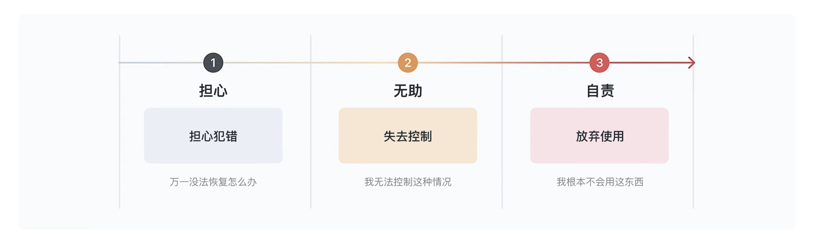 要化解錯誤帶來的負面影響,首先需要讀懂錯誤背后的邏輯與用戶心理。從類型上看,用戶出錯可分為 “失誤” 與 “錯誤” 兩類:失誤多是執(zhí)行階段的無意識行為,比如分心時點錯按鈕、輸入時打錯字符;錯誤則源于規(guī)劃階段的判斷偏差,往往是界面信息混亂、層級模糊導致用戶誤解功能。無論哪種情況,用戶出錯后的心理反應高度一致:擔心操作不可逆的恐懼、失去對流程掌控感的無助,以及將問題歸咎于自身的自責,而自責感正是導致用戶放棄使用的核心誘因。尤其在操作不可逆(如刪除數(shù)據(jù)、注銷賬號)、反復失?。ㄈ绲卿洺瑫r、表單校驗不通過)或高風險場景(如支付轉賬、數(shù)據(jù)傳輸)中,用戶的焦慮感會被急劇放大,對產(chǎn)品的信任度也會隨之崩塌。