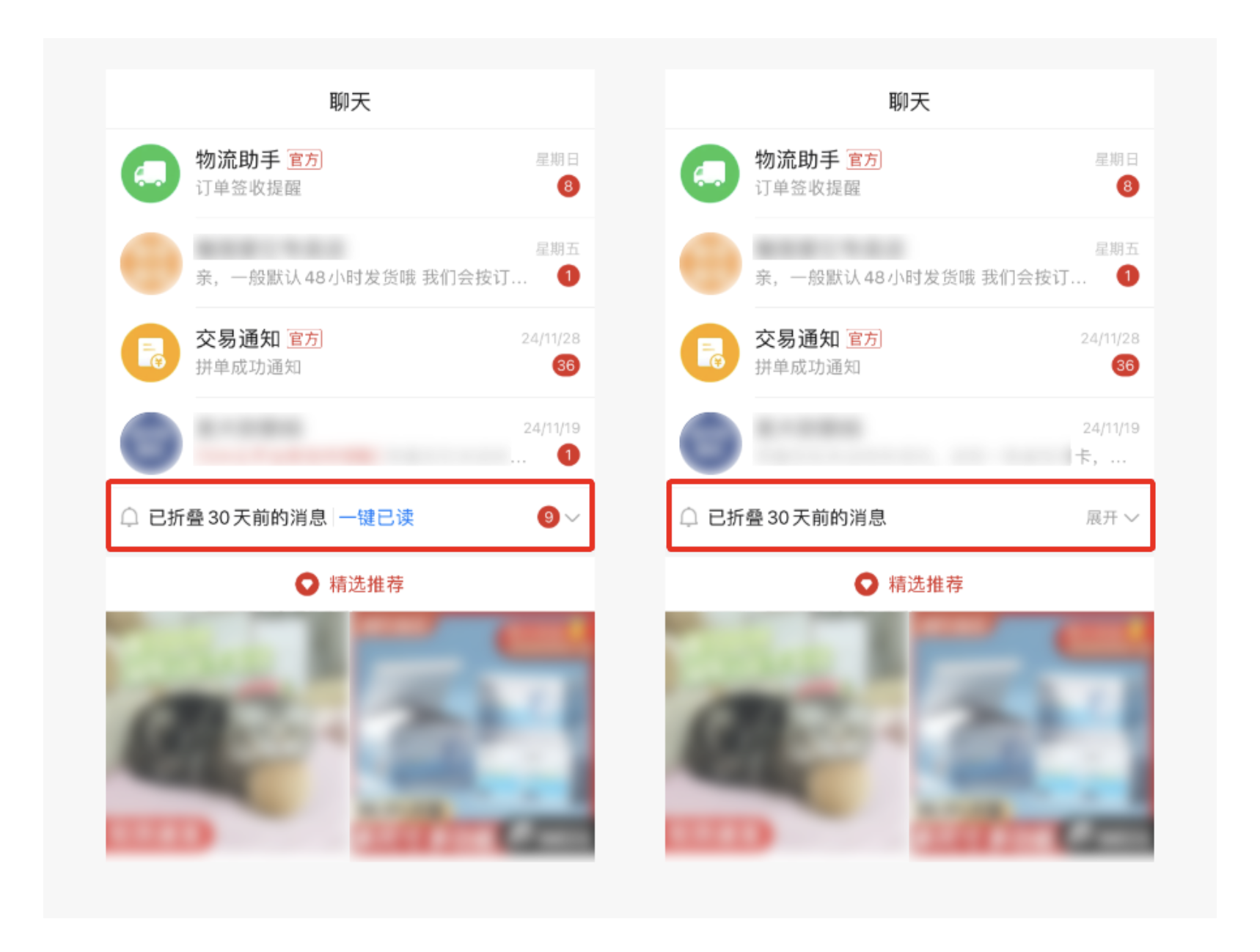 設計目的:通過分層已讀設計,平衡小紅書的社交與消費雙重屬性,既堅守了內容社交的核心,保障社交互動的有效性,又滿足了用戶清理消費類消息的需求,提升消費場景的體驗。