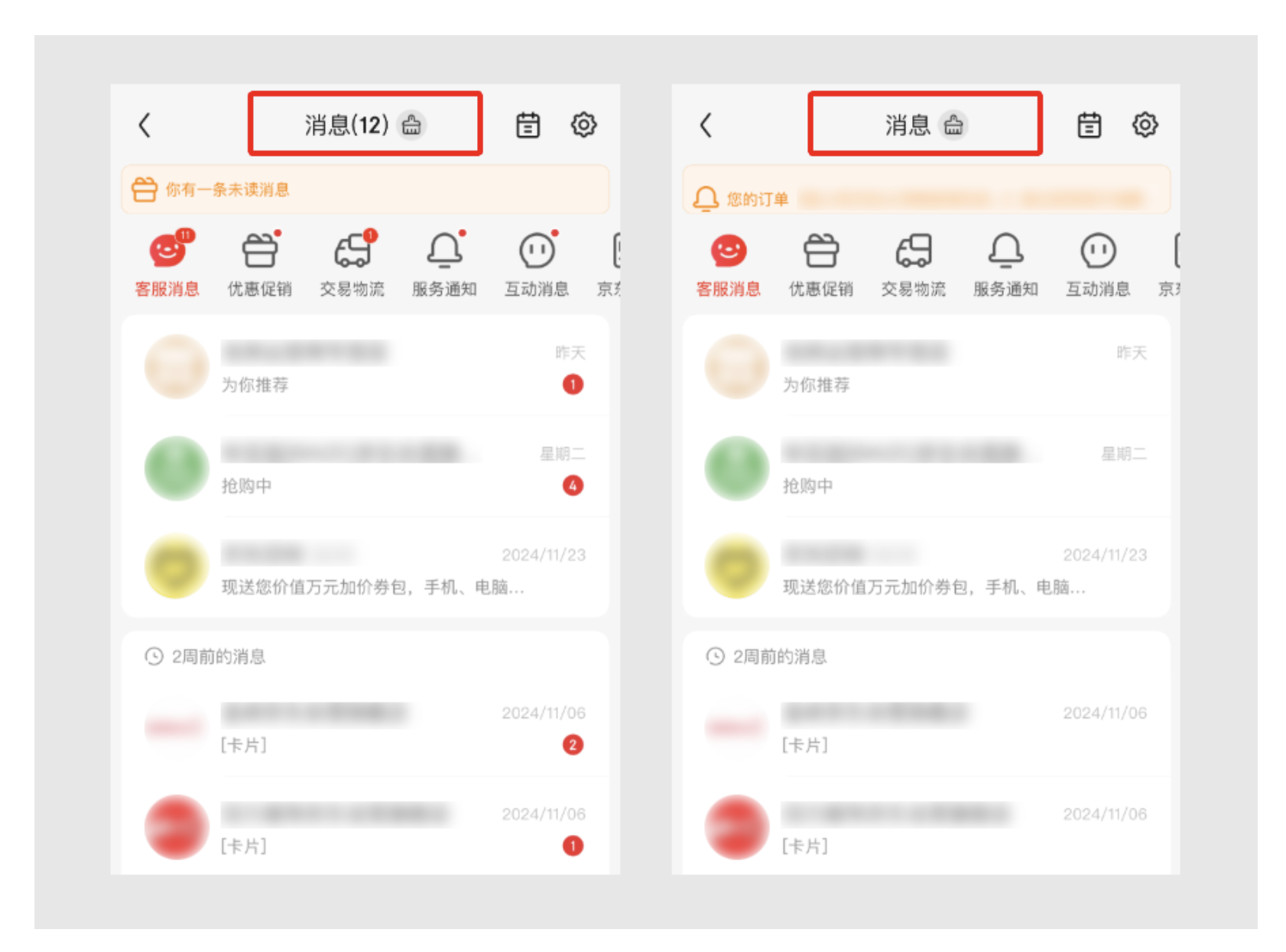 以淘寶、拼多多、美團的系統通知、商業推送為代表,這類消息的核心是平臺的商業觸達,消息價值密度低、用戶處理意愿弱,未讀消息的核心問題是 “視覺干擾與心理焦慮”。