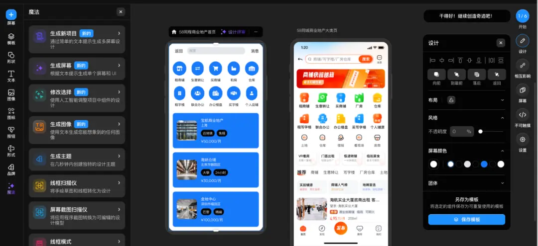 例如,設計師為 58 同城商業地產板塊設計移動端大類頁面時,僅需向 Uizard 明確設計需求:頭部導航包含返回、搜索、消息功能,入口金剛區以圖標形式展示租賃商鋪、商業轉讓等 10 個功能,下方搭配包含圖片、標題、標簽、價格的推薦列表,并選擇高精度生成模式,AI 即可在幾分鐘內完成初步的界面原型生成,大幅縮短了從草圖到數字原型的轉化時間,讓設計師能快速驗證設計概念。