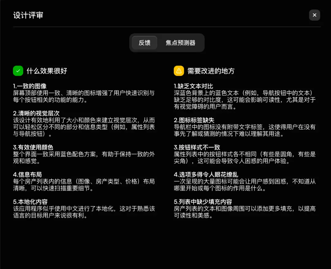 不難發現,Uizard 能高效檢測布局、配色、組件等顯性設計問題,但無法對設計背后的業務策略與用戶心智匹配度進行評估。