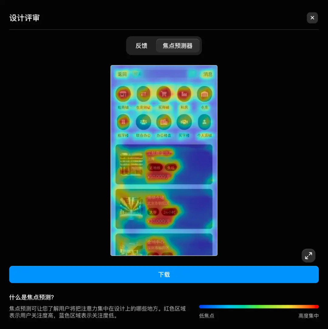 Uizard 的焦點預測功能,融合了眼動追蹤數據與機器學習算法,能精準預測用戶在界面上的注視點,用紅色標注高關注度區域、藍色標注低關注度區域,為界面布局優化提供核心依據。