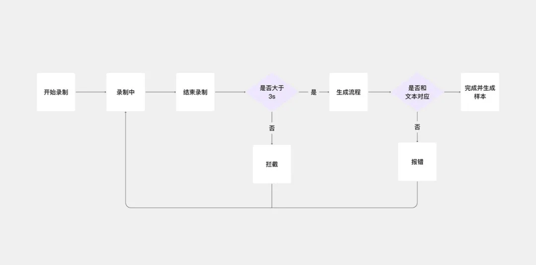 在“創作者音色復刻”項目中,作者通過“邏輯流程圖”系統性梳理用戶交互路徑,目的是梳理所有反饋節點——包括主流程的 5 個核心反饋節點,以及因系統判斷產生的 2 個反饋分支所衍生的額外 2 個反饋節點,從而確保反饋設計覆蓋完整交互路徑,避免遺漏關鍵環節。