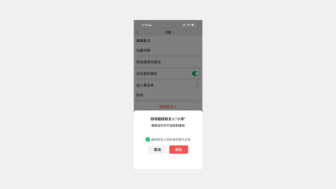 ▲微信刪除聯系人時,界面會告知用戶當前操作所造成的風險,防止用戶錯誤操作。