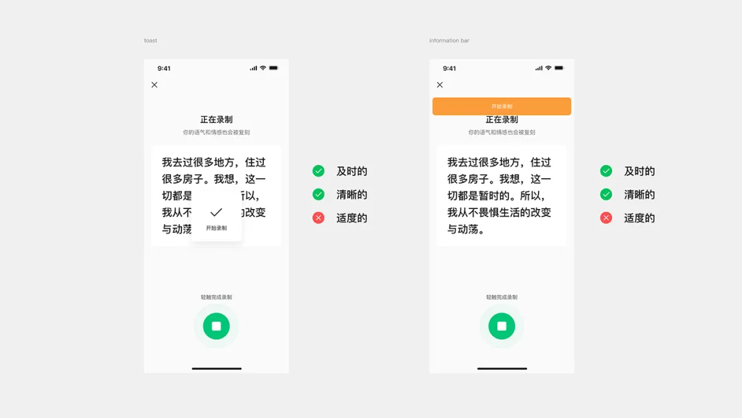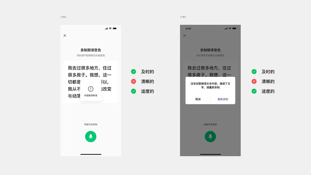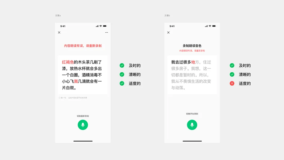 兩個優化方案在“清晰”原則得到了完善,通過精準的文字定位與明確的指引文案,消除了用戶的認知不確定性。最后綜合用戶測試評估結果,發現方案 b 會在錄制過程中,會影響用戶在閱讀時候的專注度且隨時造成用戶任務中斷,違背了“適度”原則,最終選擇了方案 a 作為落地實施方案。