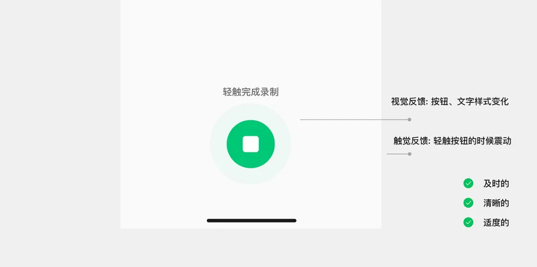 通過多輪方案迭代,我們最終采用了多通道反饋的設計策略:在保留基礎視覺反饋的同時,引入觸覺反饋維度。具體實現方式為用戶在輕觸錄制按鈕時觸發設備的短震動提示。這一設計巧妙地在不增加視覺干擾的前提下,顯著提升了狀態反饋的感知強度,既確保了操作的明確性,又保證了閱讀體驗的連貫性。更多關于觸覺體驗內容詳見:用戶界面之外:觸感體驗