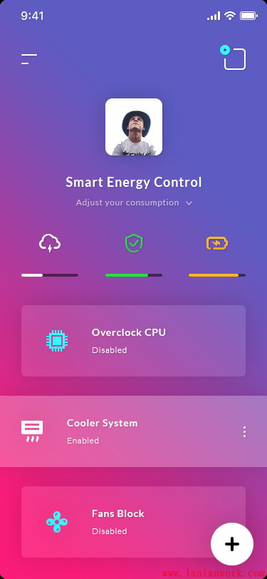 這款APP界面采用深灰色底色,沉穩大氣,有現代科技感,界面采用卡片式布局。配以粉紅和橘黃作為點綴,讓界面不因深色而顯得呆板。