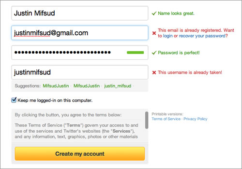 Twitter’s registration form uses both dynamic validation (for the name, email address, password and user name) and smart defaults (“Keep me logged in”).