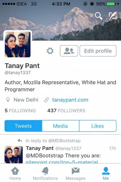 案例學(xué)習(xí):Twitter上的切換鍵被放在屏幕的端。這幫助用戶更加快速的觸碰相關(guān)鍵如主頁(Home)、通知(Notifications)、消息(Messages)、我(Me)以進(jìn)入軟件的各個部分。他們曾經(jīng)將按鍵放在了最頂端,然而這增加了大屏用戶使用難度。
