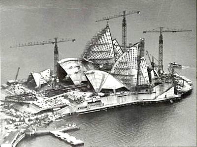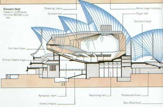 , 在最后找到一個經(jīng)濟(jì)上可以接受的解決辦法之前,設(shè)計隊伍反復(fù)嘗試了12種不同的建造“殼”的方法(包括拋物線結(jié)構(gòu),圓形肋骨和橢圓體)。后來團(tuán)隊中的某個 人建議將所有球形房頂,在同一個巨大的同心圓上切割出來。該辦法可以使用一個共同的模具澆注出不同長度的圓拱,然后將若干有著相似長度的圓拱段放在一起形 成一個球形的剖面。究竟誰是這個解決辦法的發(fā)明者至今都是爭論的話題。 深化設(shè)計后的歌劇院變成了一個暖壺,內(nèi)外被分成了壺膽和壺罩的關(guān)系,這是建筑史上思想的一次突破,從此有一種建筑它的立面和內(nèi)部空間可以毫無關(guān)系了,所謂表現(xiàn)主義建筑就在這個蛋殼下誕生了。 當(dāng)然制作這個“殼”是要付出代價的,悉尼歌劇院的“殼”由著名的建筑商Hornibrook Group Pty Ltd負(fù)責(zé)建造,Hornibrook在工廠中制成了2400件預(yù)制肋骨和4000件屋頂面板,加快了工程的進(jìn)度。這個解決辦法的成就在于利用預(yù)制混凝土 構(gòu)建從而避免了建造昂貴的模具(他同樣允許讓屋頂面板在地上就大片的預(yù)先建造組合好,而不是在高處一個一個的拼接上)。Ove Arup和合作方的工地工程師驚訝于這些“殼”在完工前使用了創(chuàng)新的調(diào)節(jié)型彎曲鋼鐵桁構(gòu)梁來支撐不同的屋頂。 第三個大麻煩幾乎使工程被擱置了,悉尼歌劇院的屋頂是由2194塊每塊重15.3噸的彎曲形混凝土預(yù)制件,怎樣的力學(xué)結(jié)構(gòu)才能讓這些水泥砣安全地架在上 面,這是所有結(jié)構(gòu)工程師不曾遇到的挑戰(zhàn),大家都沒了信心,這是掉腦袋的活呀。主意還是來自門外漢,烏特松看見孩子玩的提線木偶,放在桌子上的時候是一灘爛 泥,把線體起來就精神抖擻了。最后工程師們用鋼纜把所有的預(yù)制構(gòu)建拉緊拼成的一體,屋頂?shù)闹亓Ρ幻恳粋€角度的部件分散了,這是建筑業(yè)上的一個偉大創(chuàng)舉。 第四個大麻煩幾乎是無法逾越的,也是工程師們永遠(yuǎn)解決不了的,那就是預(yù)算不準(zhǔn)確帶來的巨額超支。這個建筑本來的預(yù)算是700萬元,但最終的造價高達(dá)1億2 千萬元以上,為此州政府幾乎一度破產(chǎn),歌劇院成為全體澳大利亞人的一塊心病。為了籌措建造悉尼歌劇院的資金,卡希爾開始發(fā)行悉尼歌劇院的彩票。漸漸地設(shè)計 師烏特松成了悉尼的千古罪人,所有人都開始詛咒這個半路出家的二把刀。他與州政府的關(guān)系也慢慢開始惡化,最終雙方選擇決裂,1966年烏特松辭職而去,并 且發(fā)下誓言從此在不登上澳大利亞的國土。 我們的總設(shè)計師甩手走人后,原設(shè)計師團(tuán)隊中的澳大利亞設(shè)計師們肩負(fù)起了歌劇院繼續(xù)修建工作,愛國主義和責(zé)任心支持者這些人在痛苦中掙扎,麻煩一個接著一個 出現(xiàn),但是解決麻煩的創(chuàng)意又一個一個誕生了,工程時干時停。整個州政府算是被綁架了,總不能扔個爛尾樓在悉尼市最美麗的港灣上吧?繼任的設(shè)計師們總體上堅 持了烏特松的設(shè)計理念,只有在最后的裝修階段,選擇了更為粗狂的風(fēng)格,看上去像是一個大毛坯房,而不是烏特松這位瑞典家居設(shè)計師腦海里原本想像的奢華浪 漫,一方面是因?yàn)槠呤甏臅r候水泥建筑非常流行,另一方面可能也是很大的原意就是建造悉尼大劇院的整個過程中一直都是缺錢的狀態(tài)。 除了建筑結(jié)構(gòu)部分的精彩,這部建筑作品還在有著建筑業(yè)內(nèi)另外的成就,首先是屋頂?shù)拇纱u,在建筑的設(shè)計初期,很多人就提出了該建筑清洗方面的質(zhì)疑,烏特松開 始設(shè)想一種不用清洗的方式解決它,一家丹麥的瓷磚公司為此投入了研究。最后悉尼歌劇院的屋頂覆蓋著105萬塊白色或奶油色的瓷磚,瓷磚是亞光與拋光的相間 排列,在太陽光的照射下閃閃發(fā)光。瓷磚經(jīng)過了特殊處理,因此不怕海風(fēng)的侵襲,也不需要清洗。對于一個1958年的建筑來說, 另外一點(diǎn),整個悉尼歌劇院采用的是集成式設(shè)計體系,所有的地板都是水泥預(yù)制件,用四條螺絲固定在地面上,隨時可以拆卸掉起,這為維修地面下面的管線提供了 最好的解決方案,這在上個世紀(jì)五十年代也是第一次有人嘗試的建筑方法。還有一點(diǎn)更加令人驚嘆,這個劇院沒有空調(diào)系統(tǒng),它的恒溫系統(tǒng)來自周圍的海水。一系列 工程學(xué)、材料學(xué)、建筑學(xué)、設(shè)計學(xué)上面的突出表現(xiàn),讓悉尼歌劇院成為了人類建筑史上的璀璨明珠。 經(jīng)過了千辛萬苦的努力與堅持,悉尼歌劇院最后在公元1973年10月20日正式開幕。開幕式邀請了英國女王親臨現(xiàn)場。悉尼歌劇院在英國女皇伊麗莎白二世
