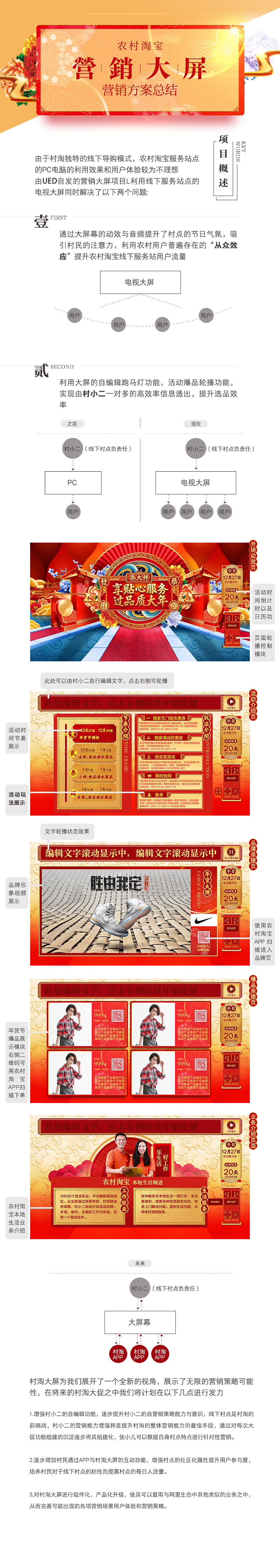 元旦已立,新春即臨,這是中國人最重要的傳統節日,也代表了農村淘寶年度最為重要大型促銷活動年貨節的即將上線。我們在本次大促之中除了完成常規的需求之外也進行了多項創新性嘗試與自發的創新項目,包括針對線下營銷場景特點的視頻制作,創新大屏的全新功能上線等等。