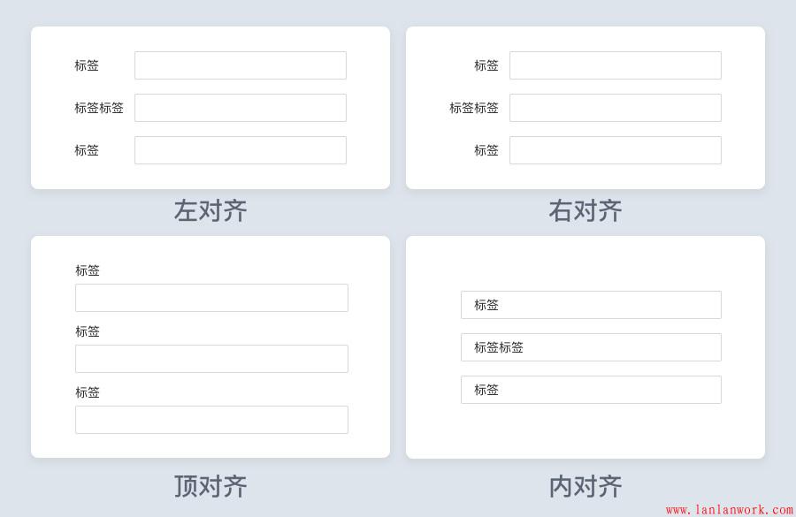 標簽對齊方式有左對齊、右對齊、頂對齊、內對齊,都有各自優(yōu)缺點,不同場景酌情使用。