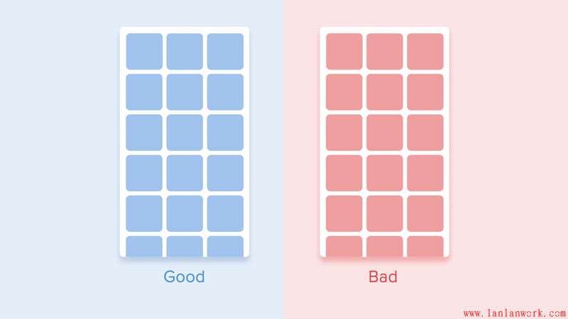 至于表格視圖,就會略微有些復雜。這種情況下,用戶往往是以對角線為焦點去看界面的,所以逐個出現的形式也比較糟糕。另外,逐個出現的動畫在時間上也會過長,而且把用戶的注意力引導成鋸齒狀,這是很不友好的。