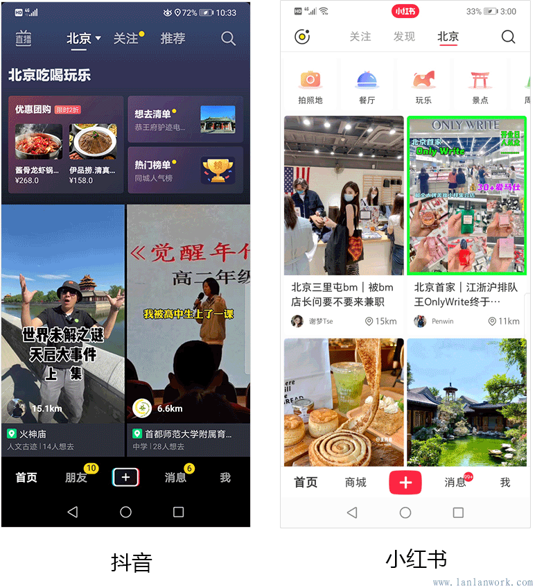 感覺小紅書比什么抖音吸引我(在沒有搜索之前推薦的東西就很吸引我),小紅書里可以學到很多東西,廚藝、書法、服裝搭配、園藝、家居、展訊,推薦的東西基本上是我感興趣的。其實這兩個APP的內容本身都是很全的,小紅書在發現和北京欄目頁面是2行2列,一頁可以展示4個視頻內容和標題,節省了刷屏選擇的時間,相對高效。
