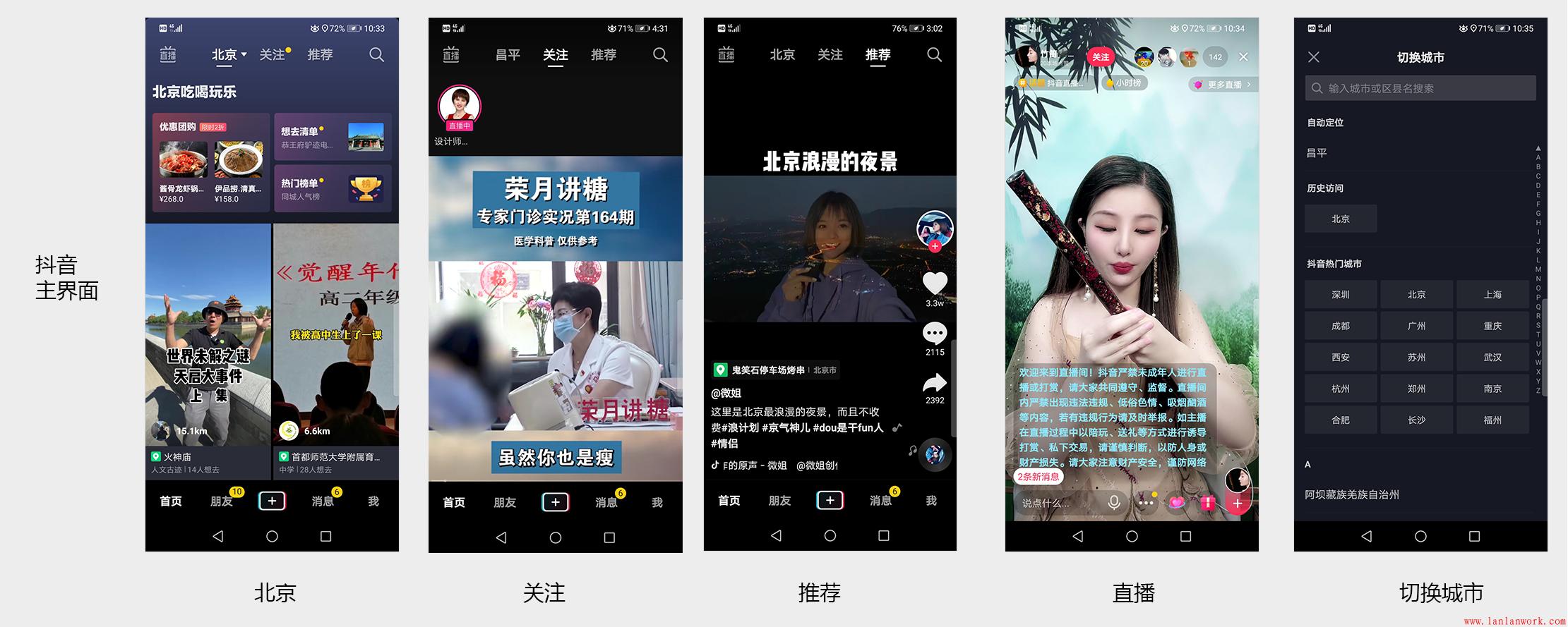 在內容的布局上,抖音基本上各欄目就是一頁寬度放一個視頻,北京欄目下部放了2列。刷一次屏得到一個內容,相對選擇性差。對于新用戶,這可能是個盲點。