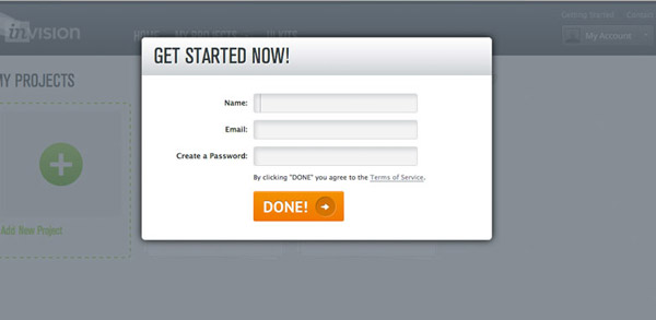 在對表單進行了充分的簡化之后,我們還可以試著通過一些設計技巧讓填寫表單的環節看上去更輕量。在這方面,我個人最喜歡的一個案例來自原型制作工具InVision的注冊表單。他們使用浮層的形式呈現表單,作為訪問者,我可以感知到,當我填寫完成之后就可以立刻回到之前的界面繼續應用流程。