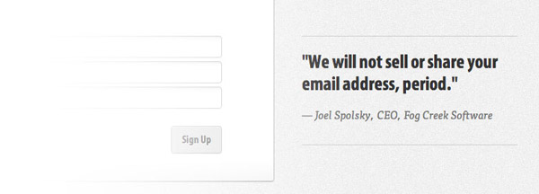 在為訪問者提供積極引導的同時,我們還要想辦法避免掉那些負面因素。人們在填寫表單時的最大顧慮就是信息被網站方收集之后的用途。用戶不會希望收到垃圾郵件,更不愿意自己的個人信息被傳播出去。如果你確實運營著一個值得信賴的產品,那么不妨直接讓用戶知道你不會把他們的信息販賣出去或是向他們發送垃圾郵件,就像FogBugz做的那樣,在注冊表單旁邊以非常直白的口語化的方式告訴用戶“我們不會出售或分享你的郵箱地址,就是這樣。”