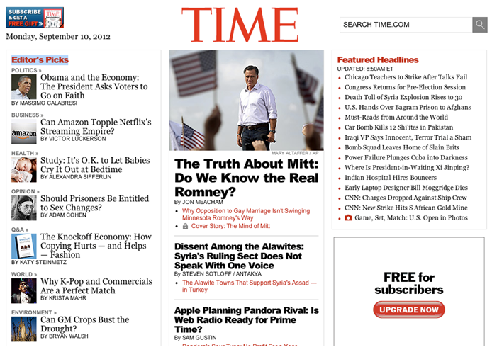 我們看新聞時首先要關注的當天的頭條新聞,其次是編輯推薦的,時代周刊首頁很好的讓頭條新聞和logo一起第一眼被我們捕捉到,主次處理的很清晰