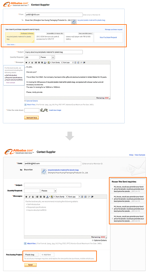 下面左圖框出部分是增加的功能,希望買家在發詢盤給供應商時能對當前的采購需求建組并復用上次的內容,在內部討論時,大家都覺得要強化該選項,讓它成為其他內容的統領,然而調研的結果卻大相徑庭,用戶無法理解這塊內容或干脆以為是貼的廣告內容而忽略;