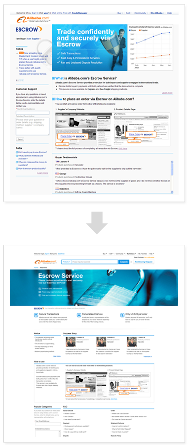 上圖我們團隊對alibaba.com提供的服務介紹頁面進行改版的項目,改版前的設計層級區分不明顯,使得用戶進入該頁面時不能快速了解服務的概況,來判斷是否繼續深入了解;而改版后通過大小的對比,呈現抓住用戶第一眼印象的信息,初步判斷符合自己的需求,用戶才會繼續瀏覽。