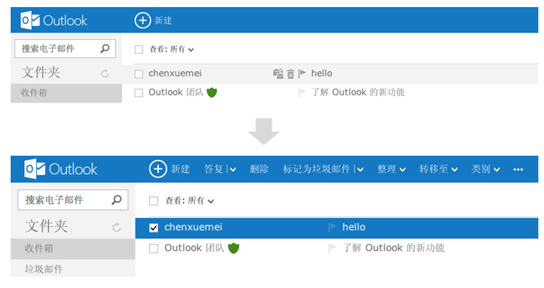Outlook郵件網頁界面,默認情況下對郵件的操作入口都是隱藏的,只有當用戶選擇了郵件之后,才會出現對郵件的操作,同時不常用的操作也會被隱藏到下拉菜單中,如“答復”菜單下隱藏的“全部答復、轉發”,這種隱藏非核心內容的處理方式,能讓用戶更集中于他可關注的信息和主要操作