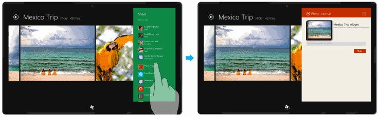 我們還可以進一步利用Metro應用獨特的功能特性,讓不同的應用訪問和使用彼此所包含的文件,例如在其他應用中使用相片日志應用里的圖片。通過這樣的功能,用戶無需首先在相片應用中將圖片下載到本地,然后再上傳到另外的應用中;系統會將所有支持文件選擇器契約的應用都看作是一個可以在任何地方讀取的文件存儲位置。
