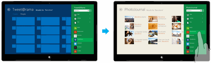 如上圖所示,用戶當前處于Tweet@Rama 應用的環境當中,出于某種需求,該用戶希望搜索相片應用當中所有包含“Barcelona”關鍵詞的相片。輸入了關鍵詞之后,用戶在搜索托盤中選擇相片應用,使其成為搜索結果提供者,這時相片應用就會自動加載,并顯示相關的搜索結果。這種方式使得用戶無需手動在當前運行的應用與搜索目標應用之間進行切換。