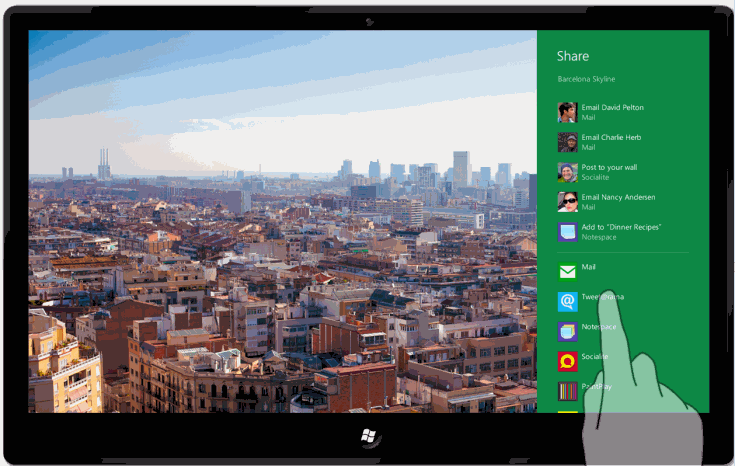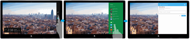而在Metro風格的應用當中,我們會使用分享契約 。這種技術方案簡化了設計與開發方面的工作,因為我們不需要為用戶有可能用到的社會化服務而將它們與每個單獨的應用都逐一整合起來。不僅是社會化服務,用戶還可以將信息保存共享至平臺上所有那些使用了分享契約的應用,而開發者們則無需擔心外部服務的接口問題。站在用戶的角度,他們可以在charms bar這個固定的地方完成有關分享的操作。