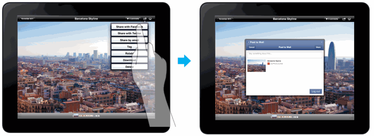 iPad版本:用戶需要點擊導航欄右側的相關動作按鈕,并從展開的列表中選擇“分享到Facebook”。如果要使應用支持更多的分享服務,開發人員必須在該應用當中逐一增添。