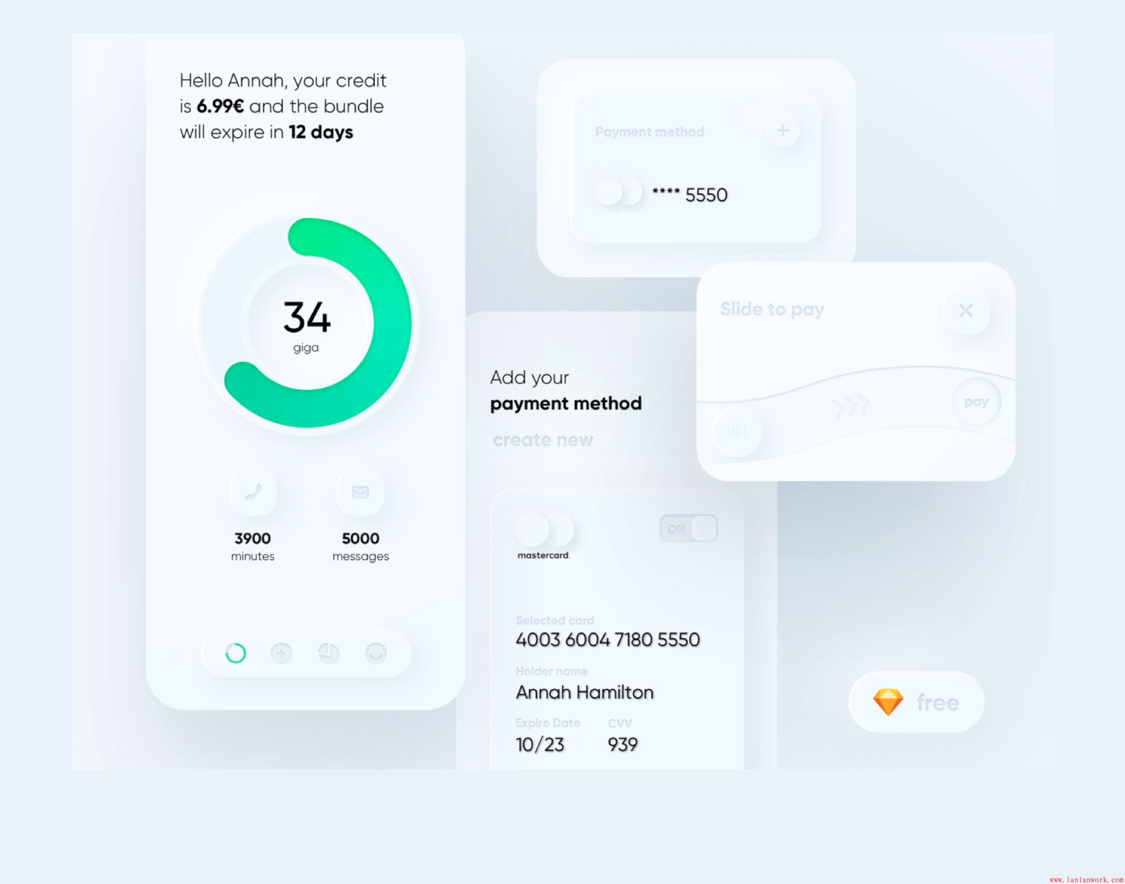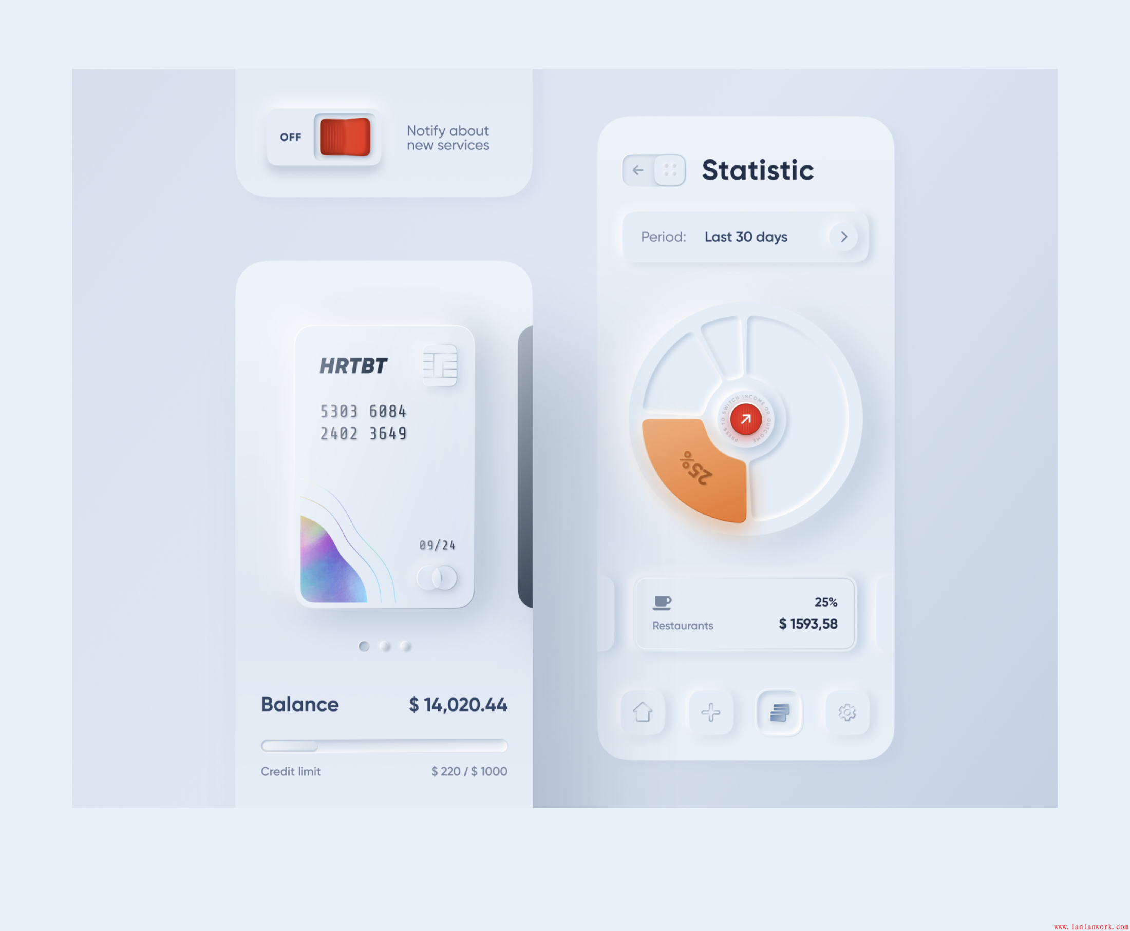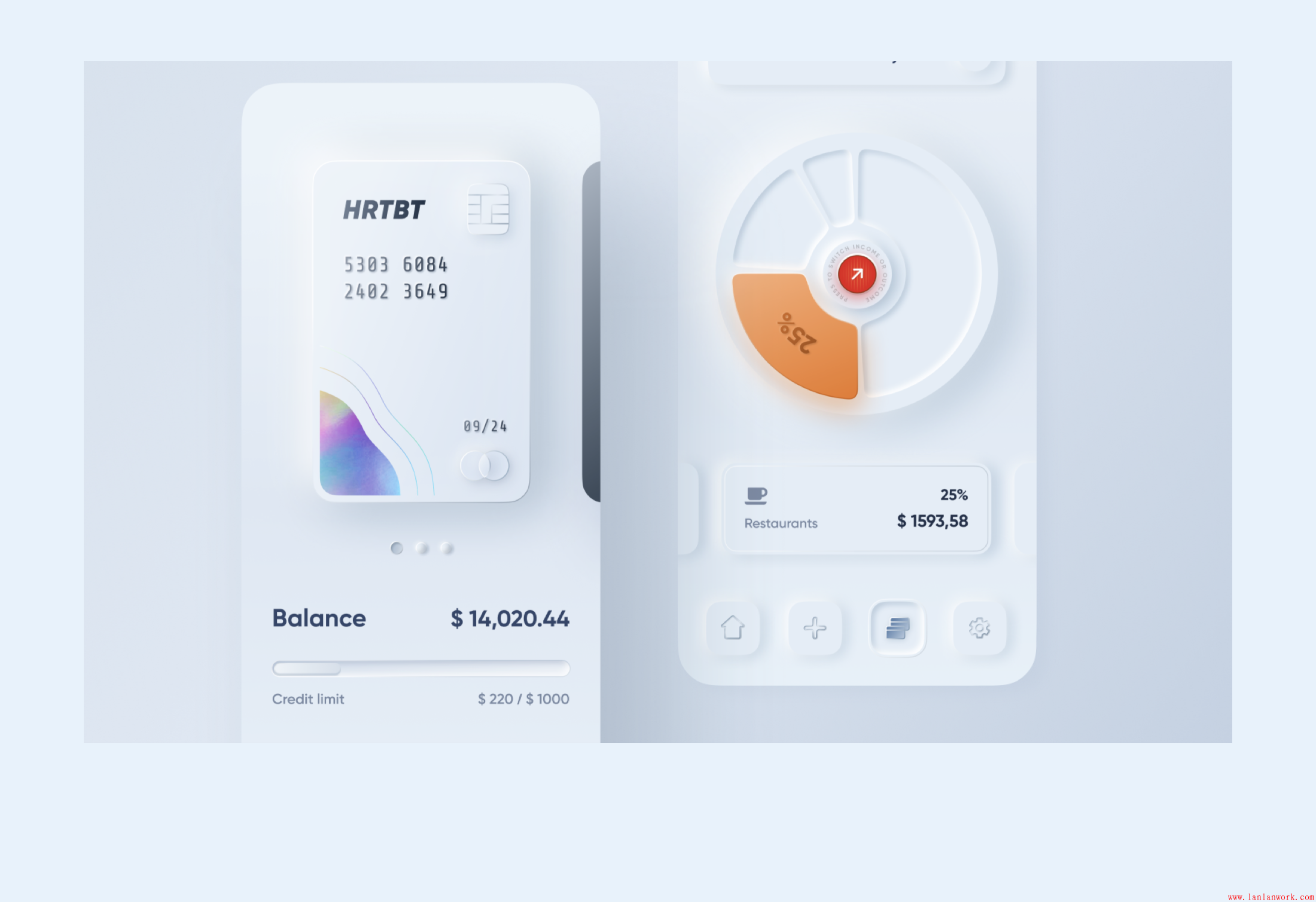 基于這一點,其實我們只要建立好卡片的和按鈕的樣式組件,新擬態在設計層的表現就可以高效率的實現,可能稍微麻煩的就是,在一些質感細節上做一些優化,前面也說到,新擬態是一種無紋理的擬物風。所以想要表現卡片/按鈕的質感,在光影、厚度細節上,需要做更多的細節處理。