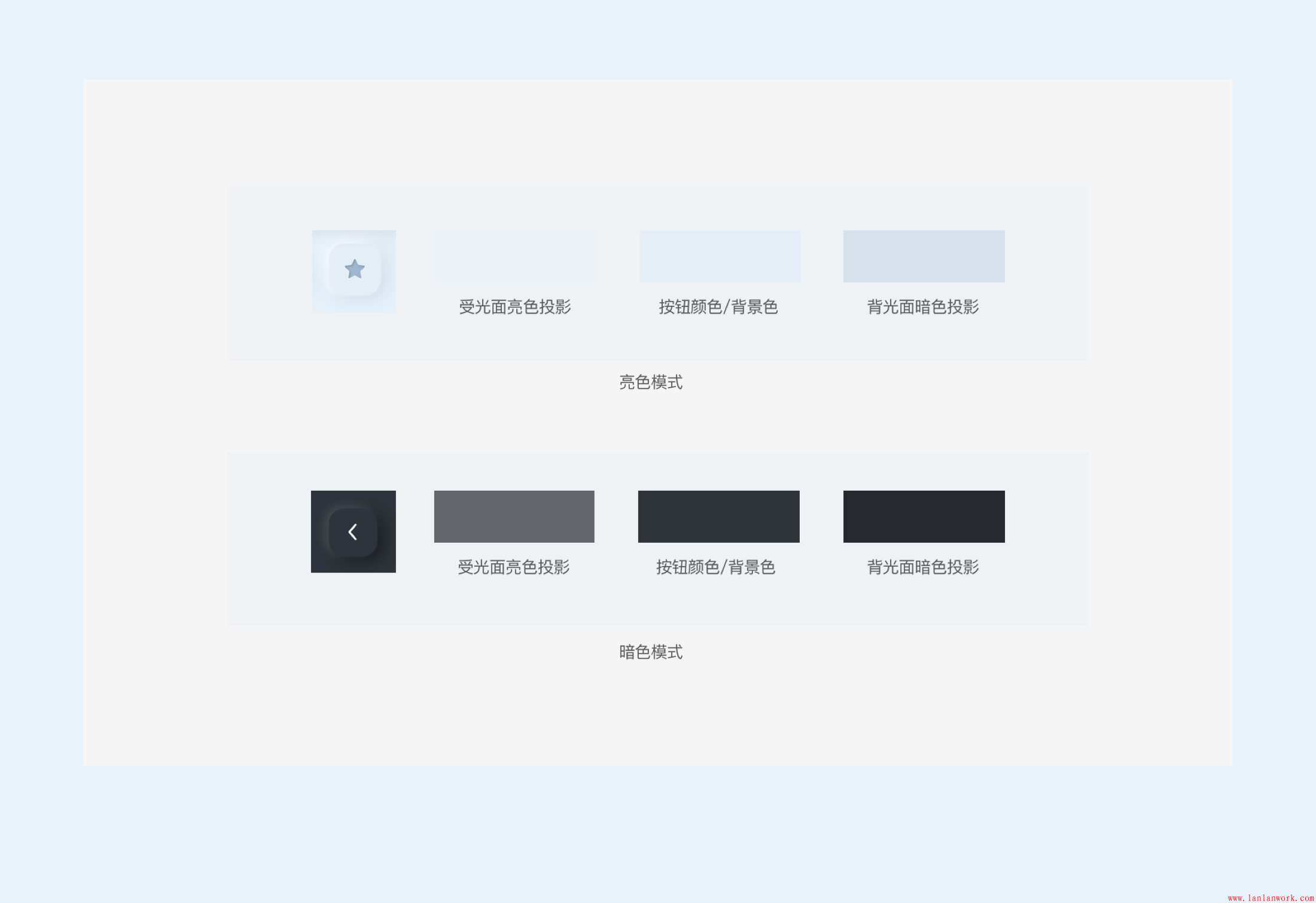 那作者在追波上按鈕也好還是卡片處理也好,仔細觀察不難發現,它定了一個光源,是從左上向右下照射的,所以,越靠近光源的部分,越亮,遠離光源的越暗(素描的繪畫時常常用到)。因為新擬態的光源是唯一的,是從左上角照射的,所以就不難解釋,或者分析得到,左上角亮色投影,右下角深色投影。這一基礎規律,不單單適用于新擬態風格的按鈕,它還適用于所有新擬態風格表現手法的視覺組件。