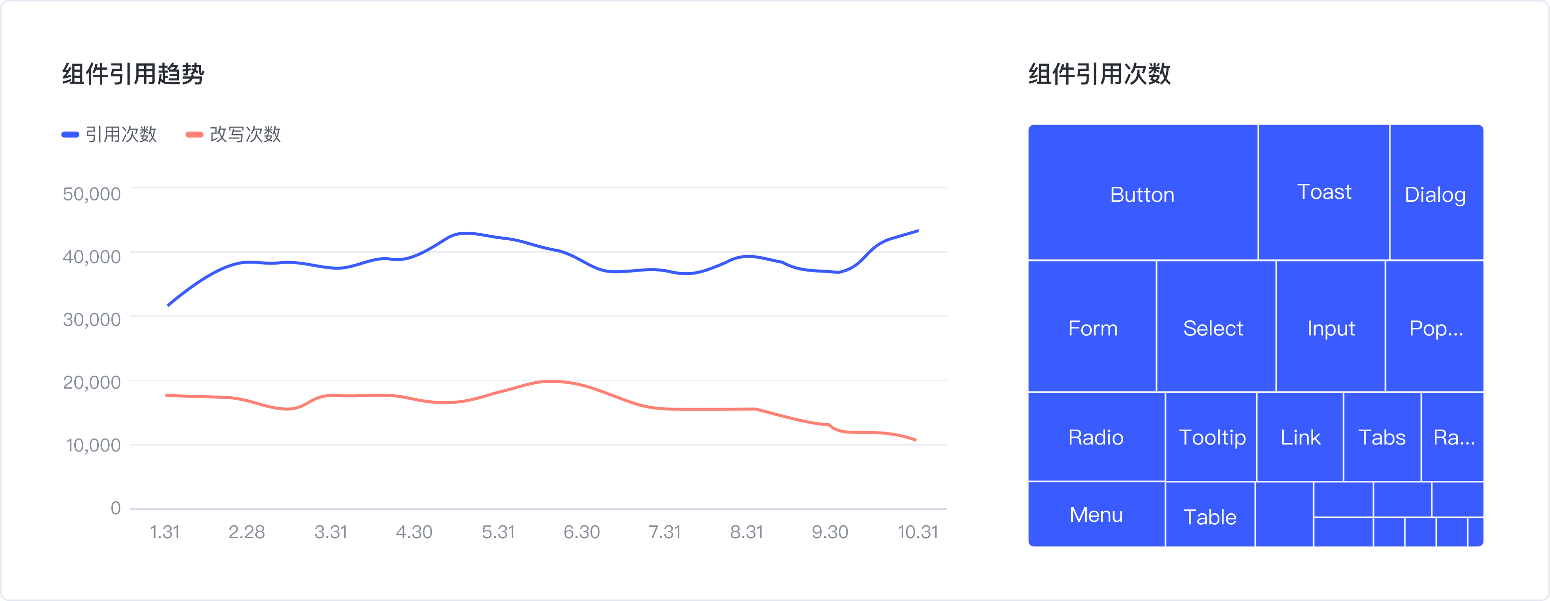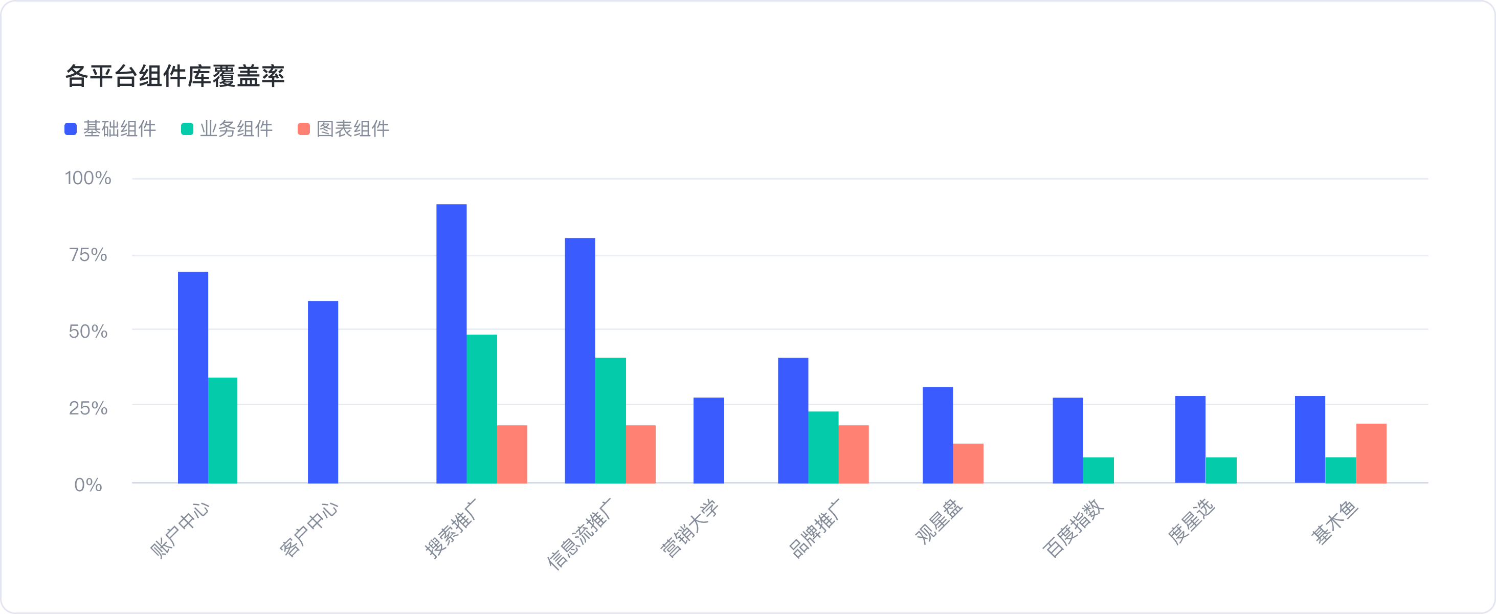 3.各平臺組件庫引用覆蓋-我們提供了基礎(chǔ)、業(yè)務(wù)、圖表3個大組件庫,從這個數(shù)據(jù)可以獲知各個業(yè)務(wù)平臺都引用了前述的哪些組件庫,以及各引用了多少組件。