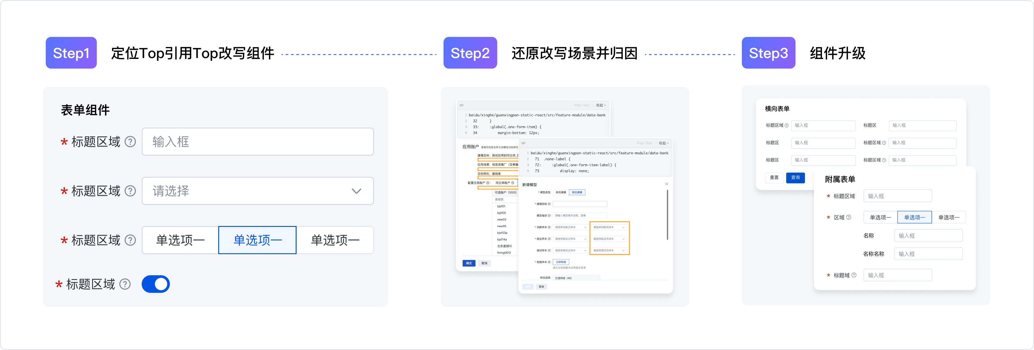 3.針對不同原因?qū)С鼋鉀Q手段進行組件升級:最后,根據(jù)上述問題,逐一進行設(shè)計和研發(fā)升級。升級后的表單組件再被業(yè)務(wù)方引用時,免去了改寫的成本,平均單次引用可節(jié)省約1h的研發(fā)耗時。
