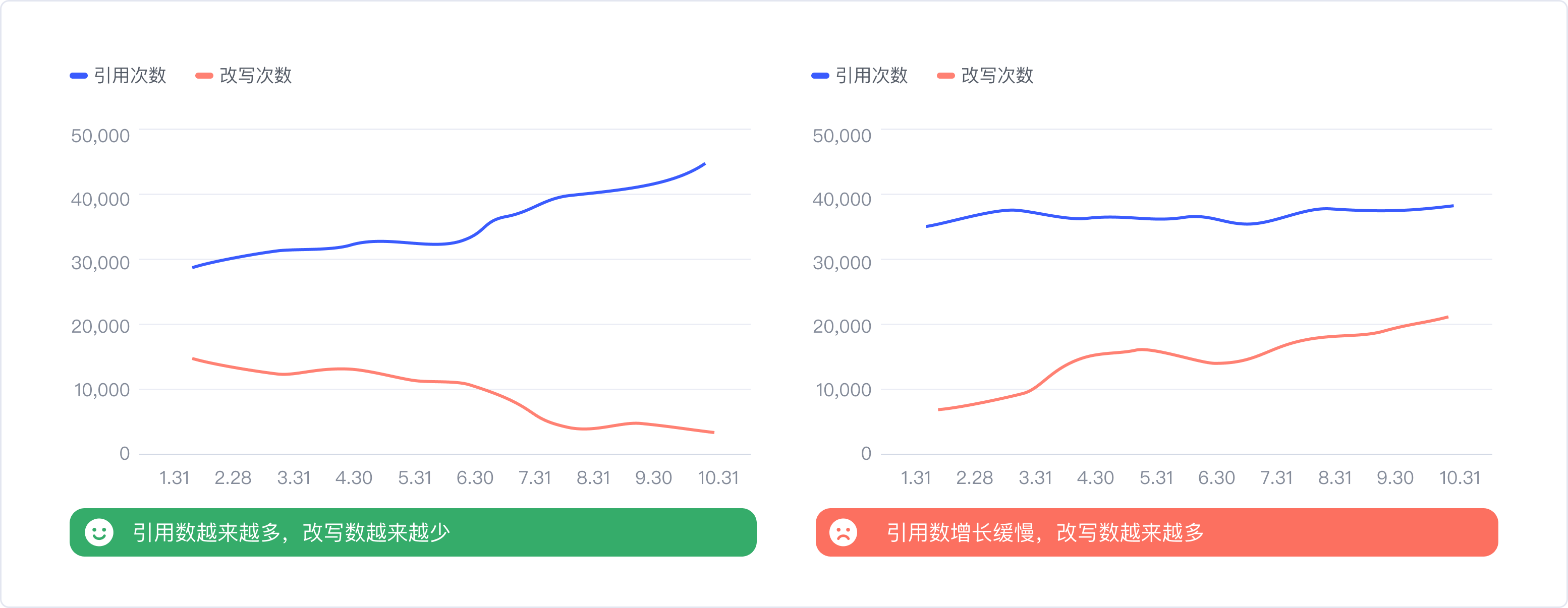 解:把所有組件的引用次數(shù)加和,得到總體數(shù)值,并結(jié)合時間維度,觀察組件庫整體改寫數(shù)與引用數(shù)各自的變化趨勢。用線形圖來描述的話,隨著時間推移,引用越多,改寫越少,兩條線呈開口狀,那就表示組件庫處于越來越健康的狀態(tài)。反之則需要警惕了。同時我們搭建了一套評分體系,基于引用/改寫數(shù)值,通過歸一化和加權(quán)等一系列計算,by月/季度給組件庫易用性打分,也能精準的知道組件庫易用性的表現(xiàn),如果分值是下降的,就要具體去定位哪些組件出了問題,再根據(jù)上述的方法相應(yīng)地進行升級。