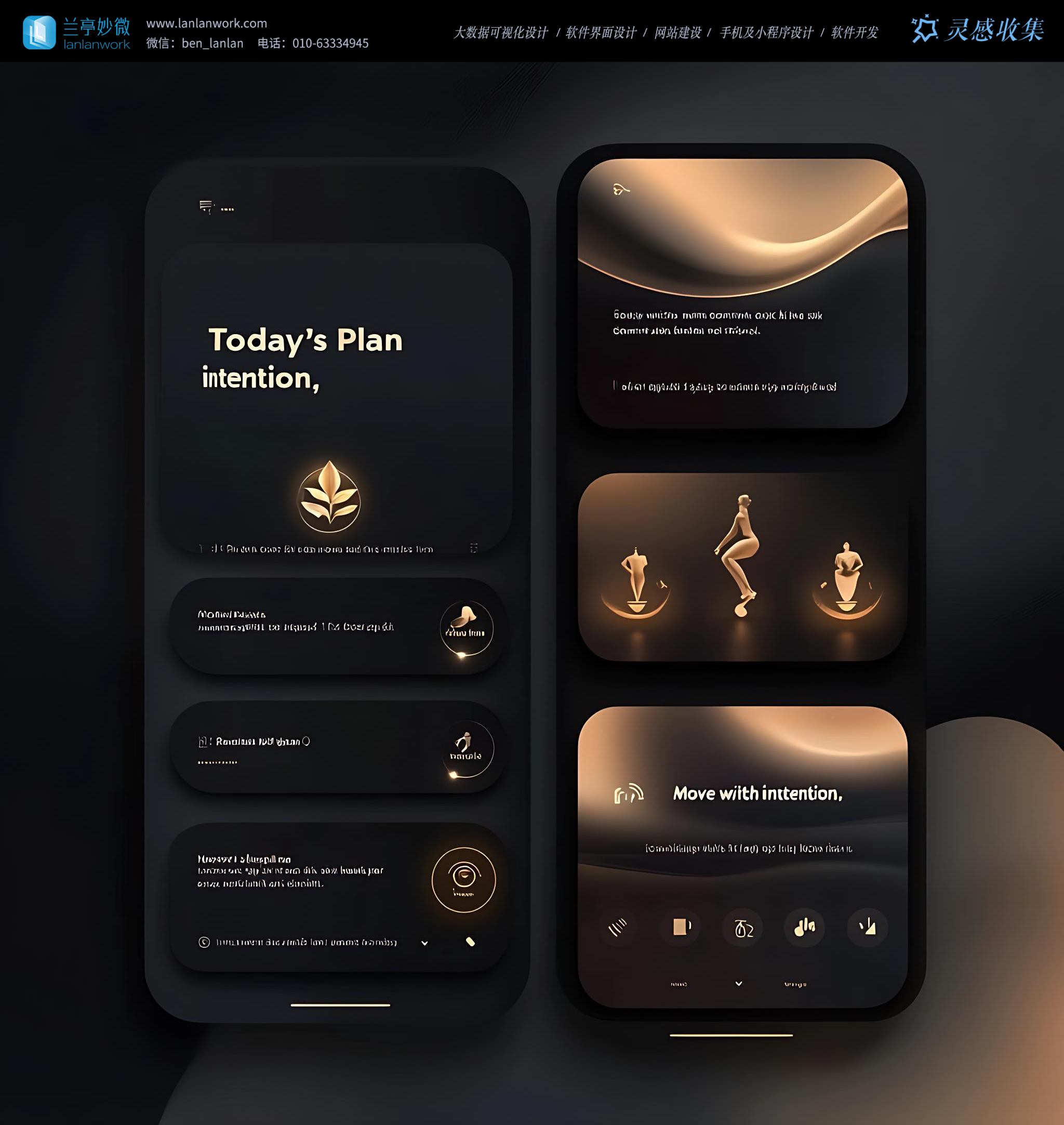 排版上采用極簡無襯線字體,通過字號、字重差異清晰區分信息層級,搭配大量留白(暗色調下的 “負空間”)和區塊化布局,既梳理了功能邏輯,又提升了可讀性與操作效率。