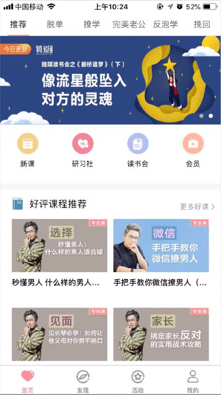 1.首頁(yè)根據(jù)產(chǎn)品的不同特色,設(shè)置了二級(jí)導(dǎo)航,將、脫單、撩學(xué)、完美老公、 反泡學(xué)、挽回等分類(lèi)作為二級(jí)導(dǎo)航標(biāo)題,既能用來(lái)統(tǒng)一呈現(xiàn)特色內(nèi)容,又能保證頁(yè) 面信息的層級(jí)關(guān)系清晰明了;